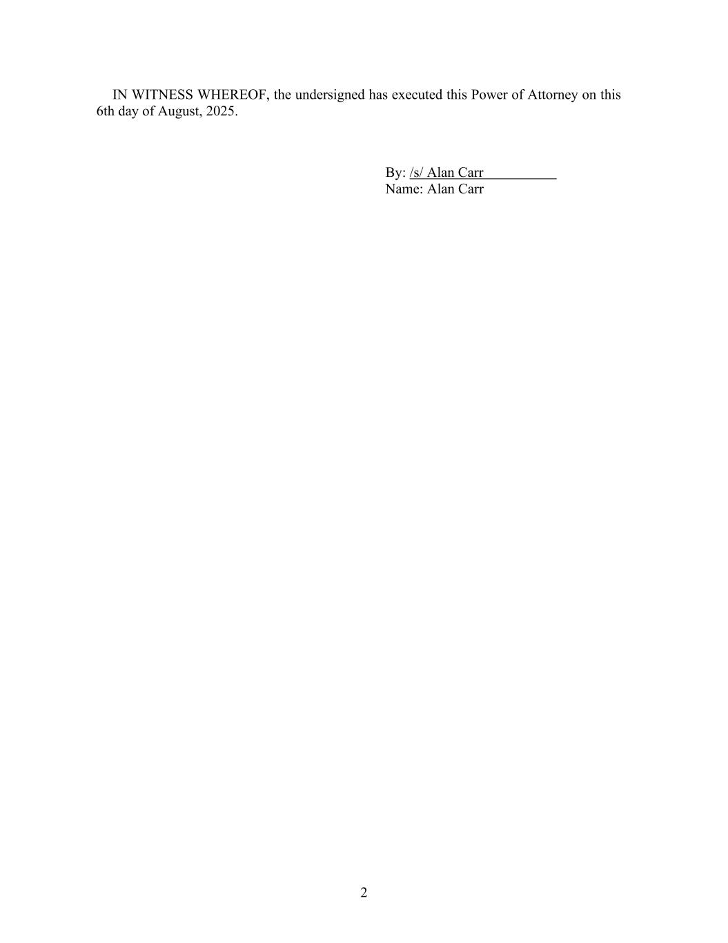 2 IN WITNESS WHEREOF, the undersigned has executed this Power of Attorney on this 6th day of August, 2025. By: /s/ Alan Carr Name: Alan Carr