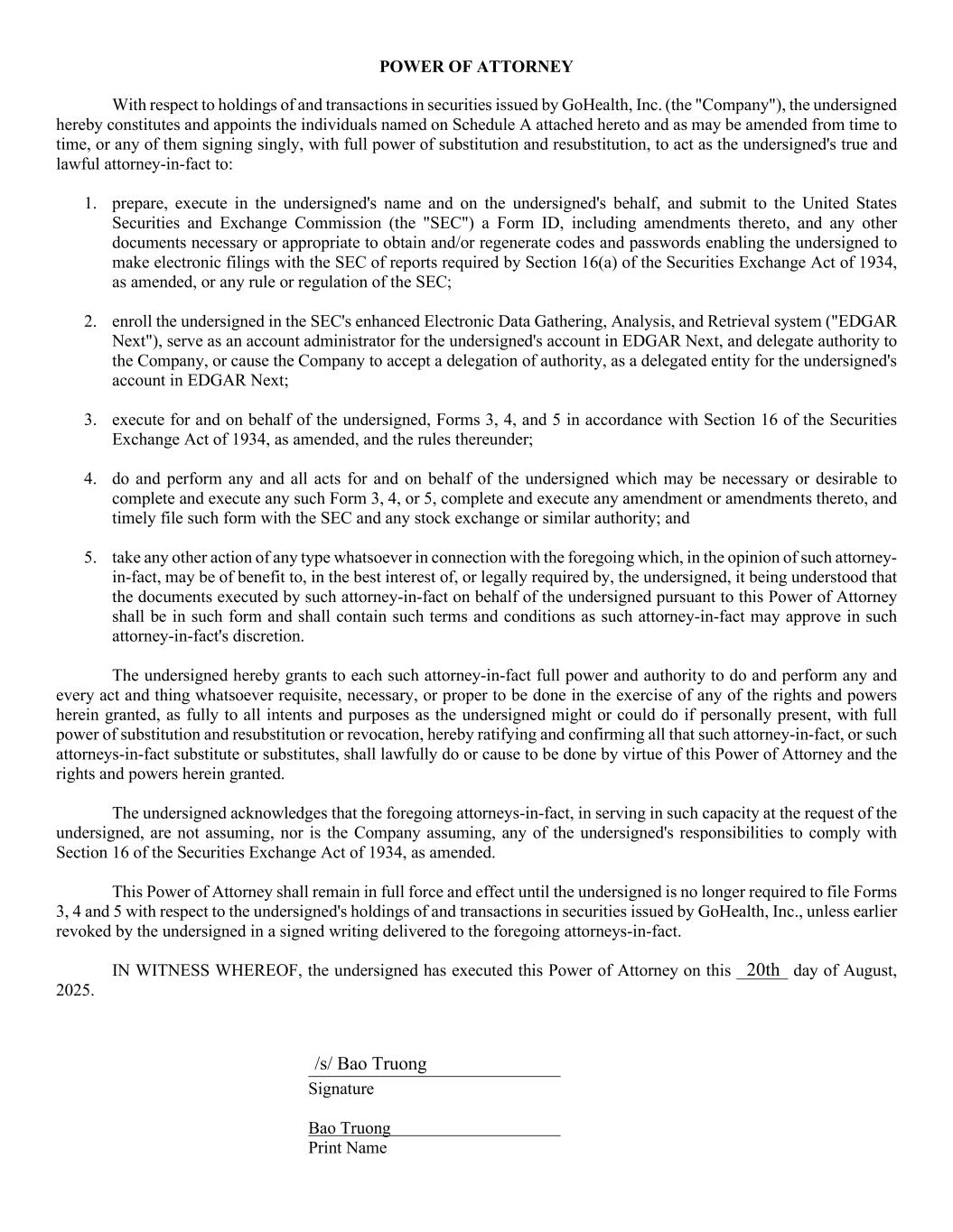 POWER OF ATTORNEY With respect to holdings of and transactions in securities issued by GoHealth, Inc. (the "Company"), the undersigned hereby constitutes and appoints the individuals named on Schedule A attached hereto and as may be amended from time to time, or any of them signing singly, with full power of substitution and resubstitution, to act as the undersigned's true and lawful attorney-in-fact to: 1. prepare, execute in the undersigned's name and on the undersigned's behalf, and submit to the United States Securities and Exchange Commission (the "SEC") a Form ID, including amendments thereto, and any other documents necessary or appropriate to obtain and/or regenerate codes and passwords enabling the undersigned to make electronic filings with the SEC of reports required by Section 16(a) of the Securities Exchange Act of 1934, as amended, or any rule or regulation of the SEC; 2. enroll the undersigned in the SEC's enhanced Electronic Data Gathering, Analysis, and Retrieval system ("EDGAR Next"), serve as an account administrator for the undersigned's account in EDGAR Next, and delegate authority to the Company, or cause the Company to accept a delegation of authority, as a delegated entity for the undersigned's account in EDGAR Next; 3. execute for and on behalf of the undersigned, Forms 3, 4, and 5 in accordance with Section 16 of the Securities Exchange Act of 1934, as amended, and the rules thereunder; 4. do and perform any and all acts for and on behalf of the undersigned which may be necessary or desirable to complete and execute any such Form 3, 4, or 5, complete and execute any amendment or amendments thereto, and timely file such form with the SEC and any stock exchange or similar authority; and 5. take any other action of any type whatsoever in connection with the foregoing which, in the opinion of such attorney- in-fact, may be of benefit to, in the best interest of, or legally required by, the undersigned, it being understood that the documents executed by such attorney-in-fact on behalf of the undersigned pursuant to this Power of Attorney shall be in such form and shall contain such terms and conditions as such attorney-in-fact may approve in such attorney-in-fact's discretion. The undersigned hereby grants to each such attorney-in-fact full power and authority to do and perform any and every act and thing whatsoever requisite, necessary, or proper to be done in the exercise of any of the rights and powers herein granted, as fully to all intents and purposes as the undersigned might or could do if personally present, with full power of substitution and resubstitution or revocation, hereby ratifying and confirming all that such attorney-in-fact, or such attorneys-in-fact substitute or substitutes, shall lawfully do or cause to be done by virtue of this Power of Attorney and the rights and powers herein granted. The undersigned acknowledges that the foregoing attorneys-in-fact, in serving in such capacity at the request of the undersigned, are not assuming, nor is the Company assuming, any of the undersigned's responsibilities to comply with Section 16 of the Securities Exchange Act of 1934, as amended. This Power of Attorney shall remain in full force and effect until the undersigned is no longer required to file Forms 3, 4 and 5 with respect to the undersigned's holdings of and transactions in securities issued by GoHealth, Inc., unless earlier revoked by the undersigned in a signed writing delivered to the foregoing attorneys-in-fact. IN WITNESS WHEREOF, the undersigned has executed this Power of Attorney on this ______ day of August, 2025. Signature Bao Truong Print Name 20th /s/ Bao Truong